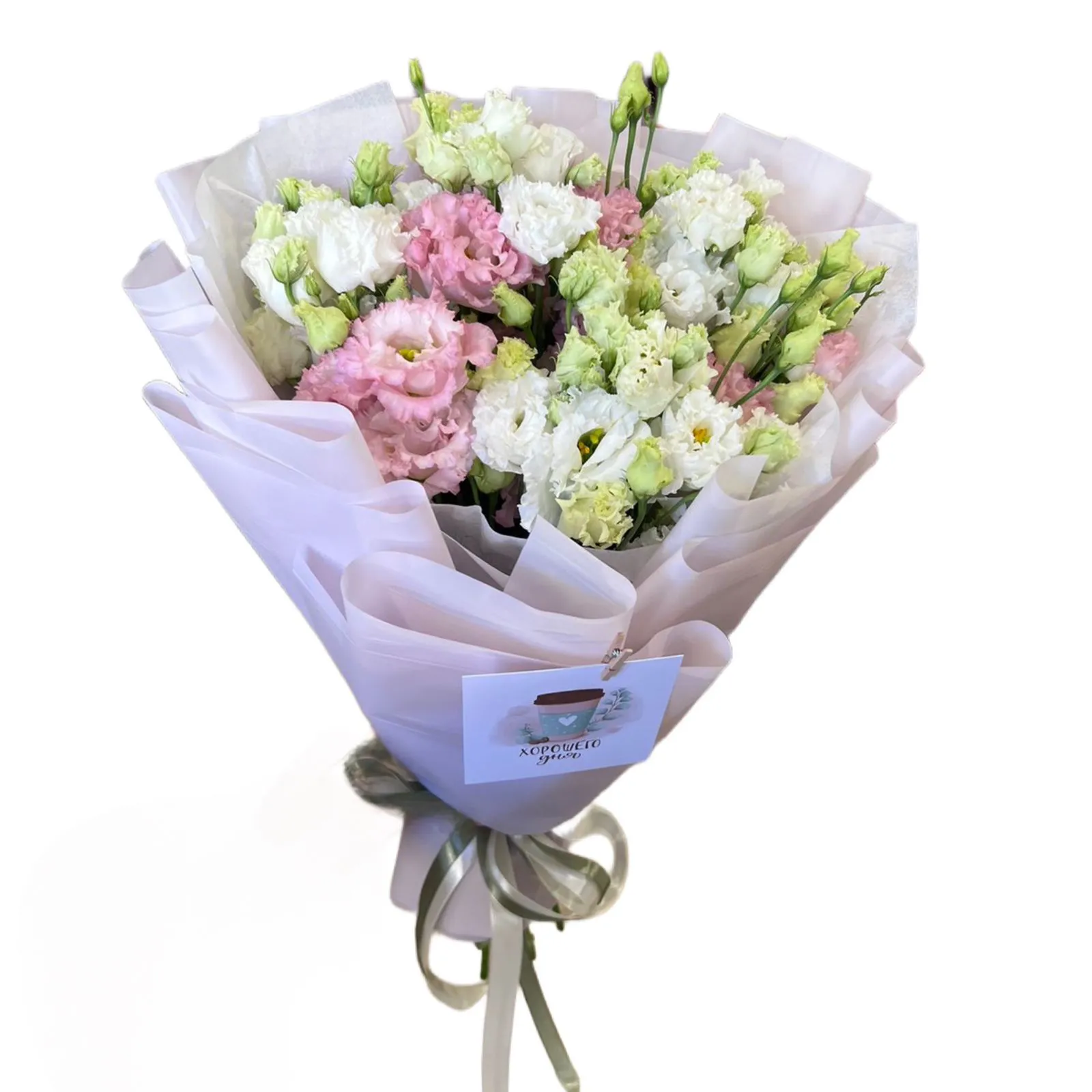 - Премиум - эустома - 15 шт., зелень, упаковка, лента