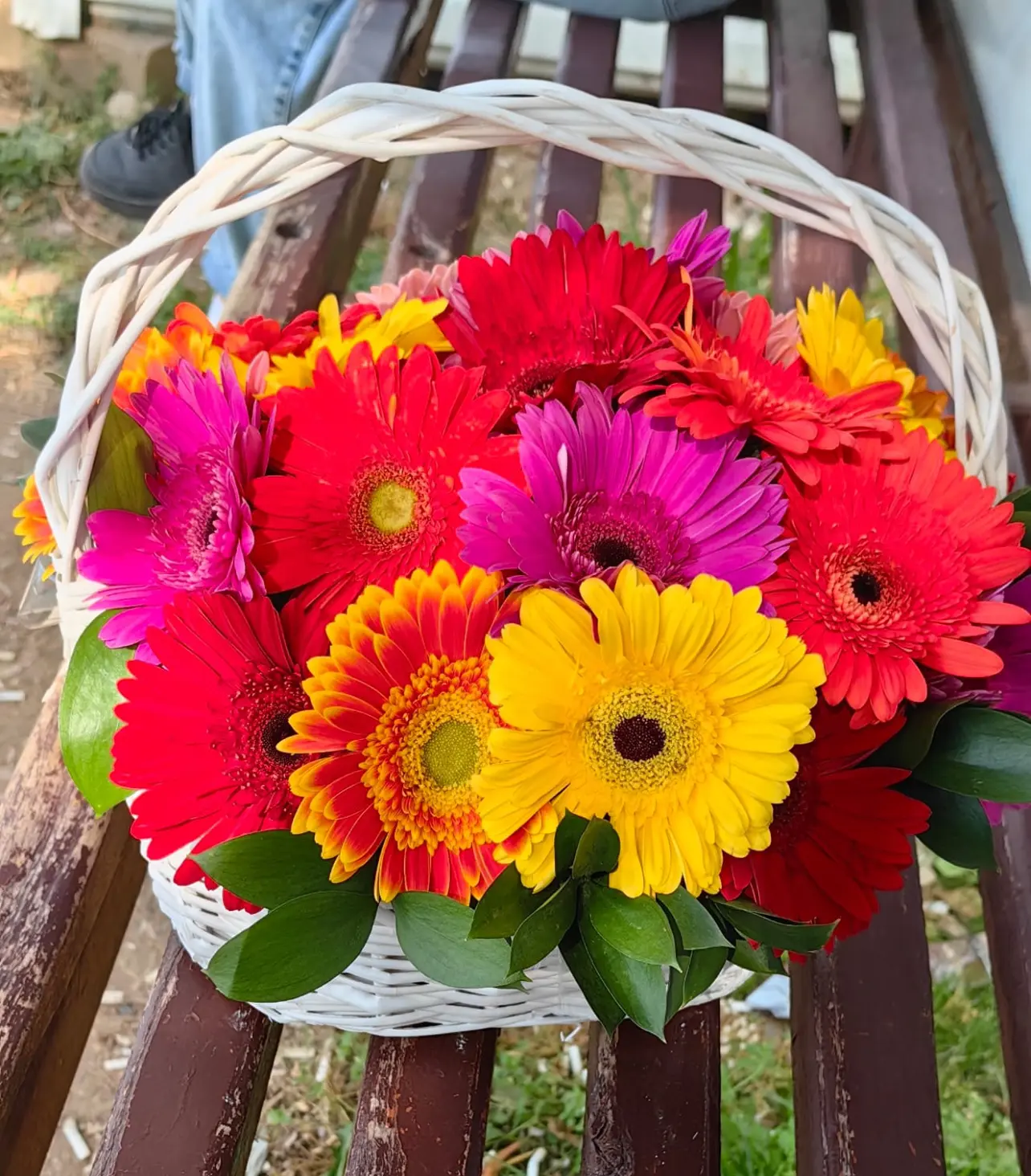Яркая композиция в корзине из разноцветной герберы - настоящий заряд радости и позитивных эмоций. Идеальный выбор для любого повода.