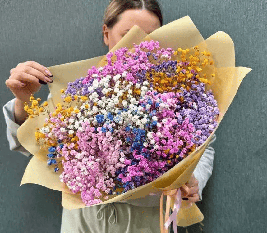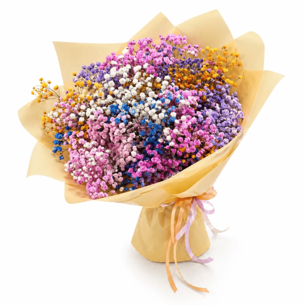 Букет из яркой разноцветной гипсофилы - это воздушная и необычная композиция, которая сразу привлекает внимание своей лёгкостью и радужными оттенками. Нежные миниатюрные цветы создают эффект «цветного облака», наполняя букет радостью, позитивом и ощущением праздника.